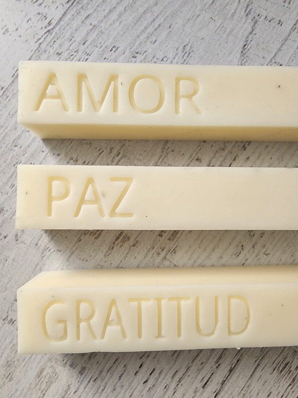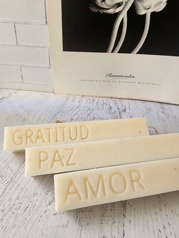 Hermoso trío de velas corpóreas con palabras AMOR, PAZ y GRATITUD ideales para cualquier momento del año; porque el amor y la paz deben ser el ancla de nuestra vida; lo que nos lleva al hogar, a los afectos más profundos, a esos momentos de los que no queremos salir...