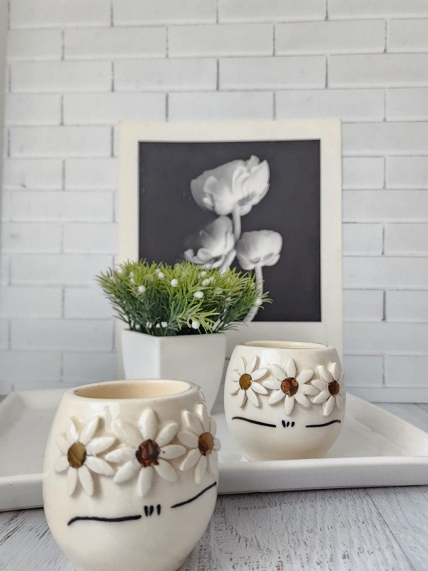 Vela de cera de soja perfumada en divertido envase de cerámica esmaltada con diseño simulando a FRIDA KHALO con sus cejas y entrecejo tupidos y con flores tridimensionales que evocan sus amadas margaritas.
