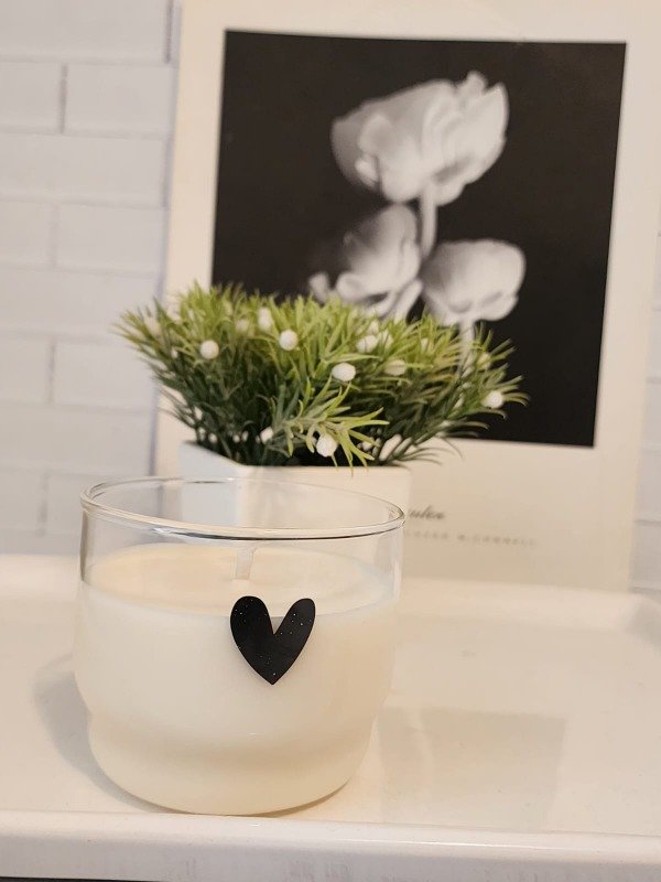 Vela de cera de soja perfumada en envase de vidrio delicadamente decorado con vinilo CORAZÓN o CARITA SONRIENTE ideales para expresar sentimientos!